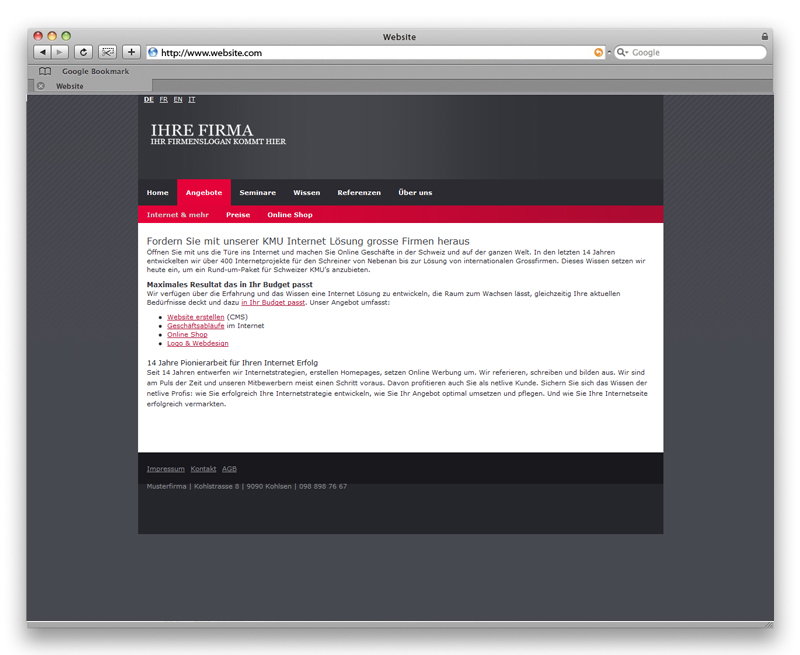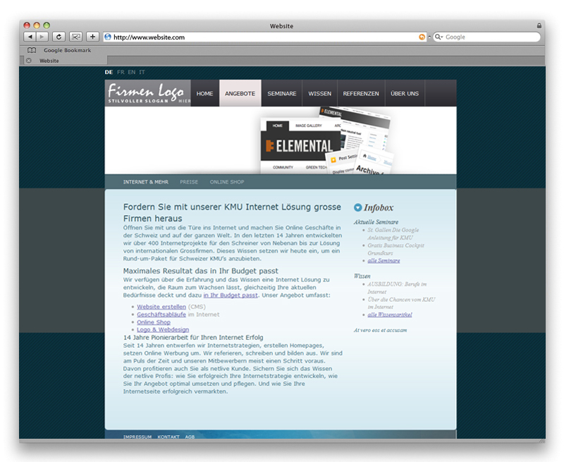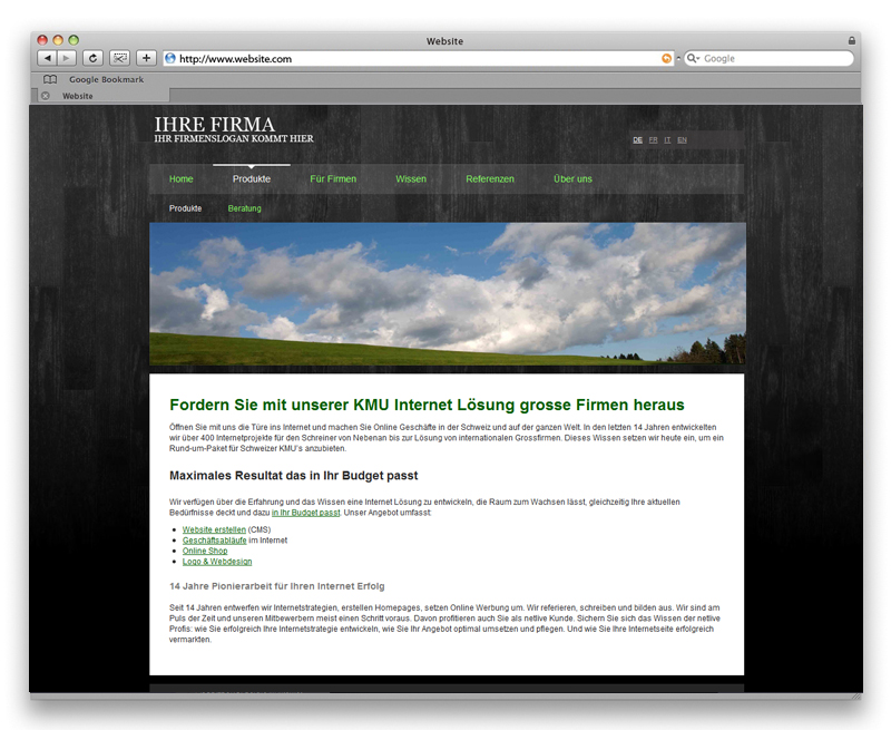 über 40 Vorlagen zur Verfügung. Sie können diese 1:1 nutzen oder an Ihre Bedürfnisse anpassen. Sie erhalten von uns die Photoshop-Datei, ändern die gewünschten Grafiken und laden diese in DEMANDIT hoch. Dazu ändern Sie das CSS und obschon Sie eine Vorlage einsetzen, erhält Ihr Design in Null Komma nichts einen eigenen Look.